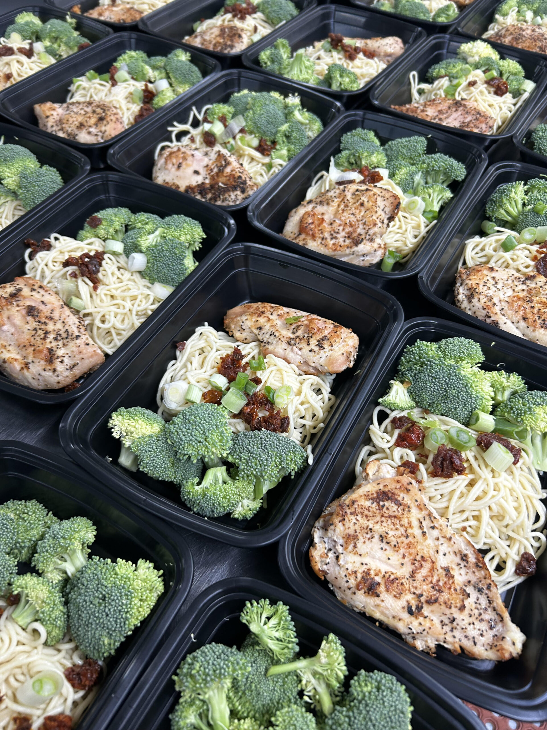 Grilled chicken breast, angel hair pasta topped with sun-dried tomatoes and fresh green onions served with a side of fresh broccoli.Â
